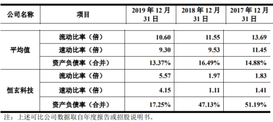 上述同期,可比公司的资产负债率均值为14.88%、16.49%、13.37%,流动比率均值分别为13.69、11.55、10.60,速动比率均值分别为11.45、9.53和9.30。