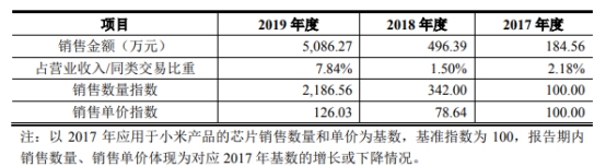 2017年至2019年,恒玄科技应用于小米产品的芯片销售金额分别为184.56万元、496.39万元、5086.27万元,占营业收入比例分别为2.18%、1.50%和7.84%。
