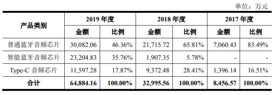 2017年至2019年,公司应用于耳机产品的芯片销售收入占比较高,分别为99.29%、93.20%和95.42%,而在非耳机市场形成的收入规模占营业收入的比例相对较小,产品终端应用形态呈现相对单一的特征。