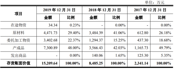 2017年至2019年,恒玄科技的存货账面价值分别为2341.14万元、8485.25万元及15,209.64万元,占总资产的比例分别为21.49%、39.33%和24.11%,主要由原材料、委托加工物资、产成品构成。
