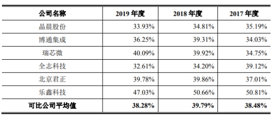 同期可比公司的毛利率均值为38.48%、39.79%和38.28%,恒玄科技2018年和2019年毛利率不及行业均值。