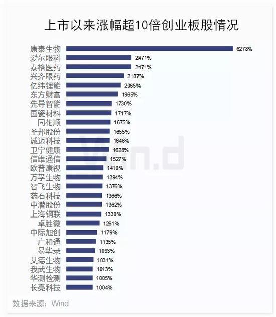 而自开市以来,创业板更是牛股辈出。Wind数据显示,目前已有428只股票上市以来涨幅超过100%,占创业板股票总数的一半以上。这其中有86只股票上市以来涨幅超过500%,更有27只股票涨幅超过1000%,板块中个股长期投资价值也较高。