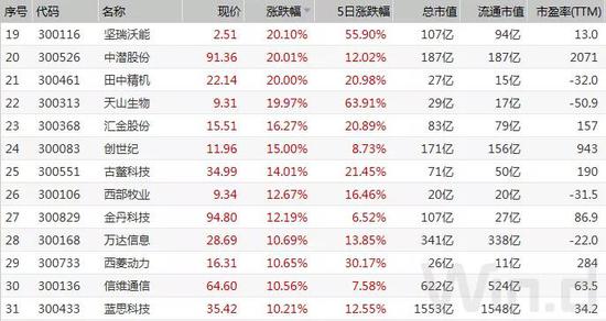从今天上市的创业板公司流通市值来看,虽然普遍涨幅较大,但流通市值多在10-30亿元之间,容易引发市场炒作。