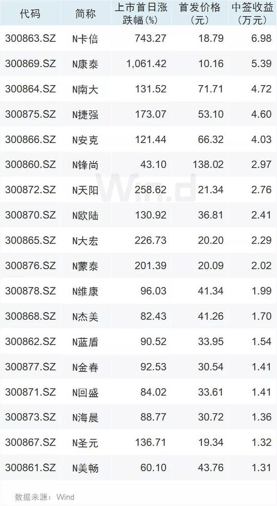 从8月24日上市创业板公司中签收益来看,以收盘价测算,中签的500股全部卖出的话,收益均超过1万元,其中N卡倍收益最高,达6.98万元;N康泰、N南大、N捷强、N安克中签收益均超过4万元。