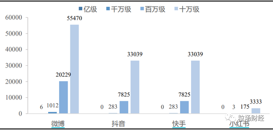 像李佳琦、薇娅、papi酱这样的头部红人毕竟数量有限,大部分红人粉丝数量低于10万级。根据克劳锐指数,以抖音账号为例,粉丝量千万级、百万级、十万级账号占比分别为0.7%、19.0%、80.3%(截至2020.4.13),红人领域呈现中长尾基数庞大、头部优质红人稀缺的特征。