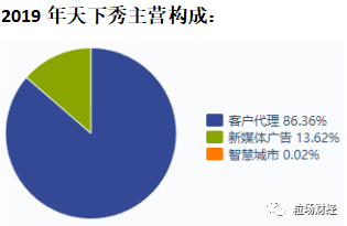 2019年,新媒体营销客户代理服务业务占总营收的86.36%,天下秀的业绩增长也是由新媒体营销客户代理服务业务贡献。