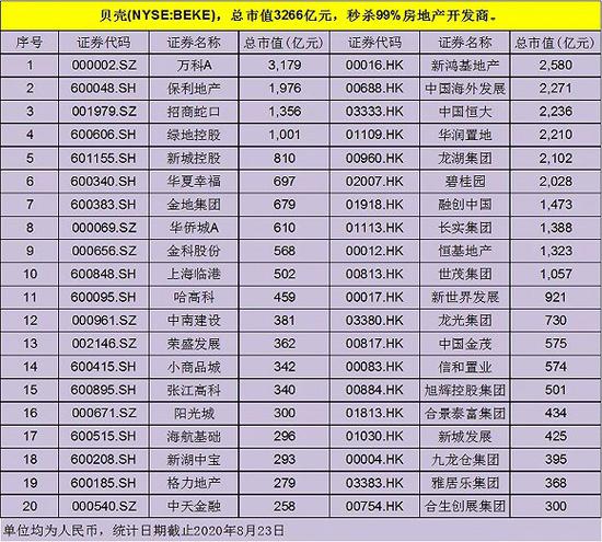 截止2020年8月23日,贝壳市值472亿美元,折合人民币3266亿元;房地产开发商常青树大哥万科A(SZ:000002)市值3179亿元。其它的老牌房地产开发商: