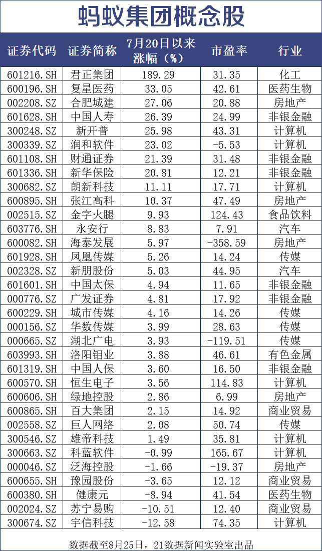 7月20日,蚂蚁集团就宣布启动在上交所科创板和港交所主板共同上市计划。受此影响,君正集团从7月20日到8月10日累计上涨243.51%。