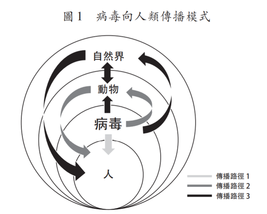作为病毒的动物宿主,几乎包括了从飞禽、走兽、家畜到水产品,从鹦鹉、蝙蝠、其他鸟类,到猪马牛羊、家庭宠物、鱼类,其中还有野生动物。野生动物体内含有大量上百万年积累下来的病毒,人类则几乎没有接触过,因而是更大的威胁。病毒在自然界、动物和人类之间,存在着相当稳定的传播关系(图1):