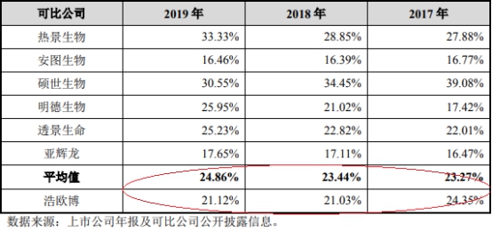 2017年至2019年,浩欧博同行业上市公司销售费用率均值分别为23.27%、23.44%、24.86%。