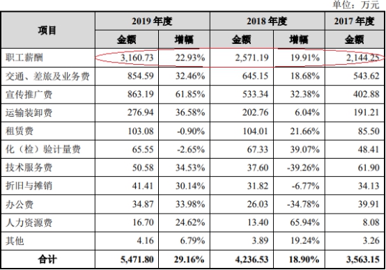 2016年至2019年,浩欧博销售费用分别为3126.21万元、3563.15万元、4236.53万元、5471.80万元;其中,职工薪酬分别为1783.91万元、2144.25万元、2571.19万元、3160.73万元。