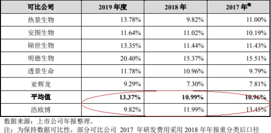2017年至2019年,浩欧博同行业上市公司研发费用率均值分别为10.96%、10.99%、13.37%。
