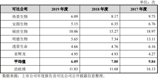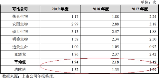 2016年至2019年,浩欧博存货周转率分别为1.73次、1.29次、1.35次、1.52次;2017年至2019年行业均值分别为2.19次、2.18次、1.94次。
