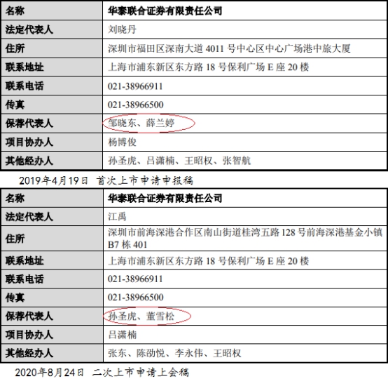 中国经济网记者发现,浩欧博前后两次申请上市,发布的两版招股书中,保荐机构均为华泰联合证券有限责任公司,但首次申请招股书中,其保荐代表人为邹晓东、薛兰婷,二次申请招股书中,其保荐代表人为孙圣虎、董雪松。