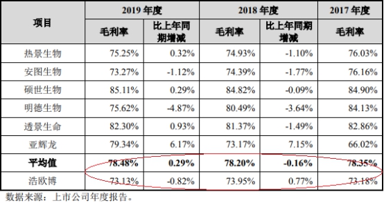 2016年至2019年,浩欧博同行业上市公司体外检测试剂毛利率均值分别为79.32%、78.35%、78.20%、78.48%。