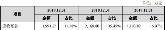 2016年至2019年,浩欧博应收账款账面价值分别为615.54万元、1103.82万元、2168.80万元、1991.25万元;占流动资产比例分别为11.67%、16.07%、15.45%、11.28%。
