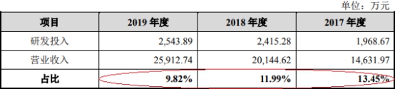 2016年至2019年,浩欧博研发投入分别为2334.85万元、1968.67万元、2415.28万元、2543.89万元;占营业收入比例分别为20.92%、13.45%、11.99%、9.82%。