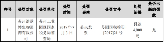 招股书显示,浩欧博前身苏州浩欧博生物医药有限公司曾因丢失发票,遭苏州工业园区国家税务局稽查局罚款4000元。