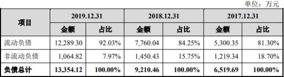 2016年至2019年,浩欧博负债总计分别为6793.91万元、6519.69万元、9210.46万元、1.34亿元;其中,流动负债分别为5475.57万元、5300.35万元、7760.04万元、1.23亿元,非流动负债分别为1318.34万元、1219.34万元、1450.43万元、1064.82万元。