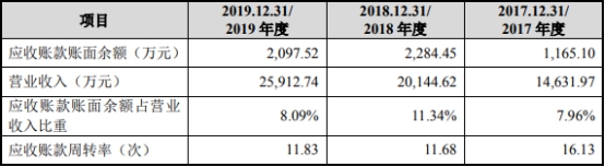 2016年至2019年,浩欧博应收账款账面余额分别为649.34万元、1165.10万元、2284.45万元、2097.52万元;占营业收入比重分别为5.82%、7.96%、11.34%、8.09%。