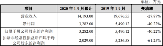 根据公司财务部门测算,公司2020年1-9月营业收入为1.42亿元,同比下降27.87%;归母净利润为3282.00万元,同比下降40.22%;扣非后归母净利润为2029.00万元,同比下降61.25%。
