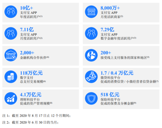 【线上消费贷与小微贷】截至2020年6月30日平台促成的消费信贷余额为1.73万亿元、小微经营者信贷余额为4217亿元。蚂蚁与约100家银行合作伙伴合作开展业务,包括全部政策性银行、大型商业银行、全部股份制商业银行、领先的城商行和农商行、外资银行,同时也与信托公司合作。