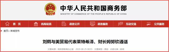 当地时间8月24日,美国贸易代表办公室发表声明称,美方贸易代表特希泽、财政部长姆努钦当晚与中国副总理刘鹤举行例行电话会议,讨论了历史性的美中第一阶段经贸协议执行情况。