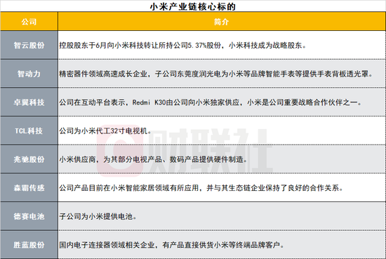 小米产业链核心标的如下图所示,其中包括智云股份、智动力和TCL科技等个股。
