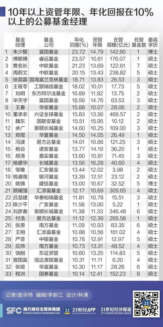 21世纪资本研究院以10年周期为统计期限研究,整个行业有10年资管年限,且年化收益超过10%的公募基金经理仅有33位。