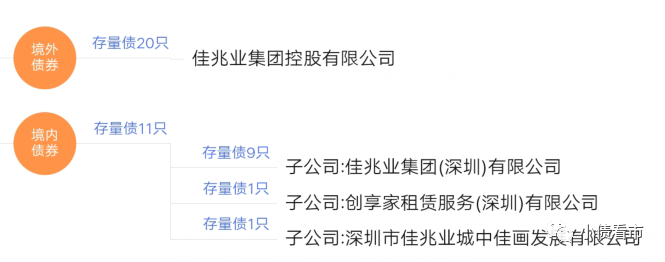 在债券融资方面,目前佳兆业集团存续境外债券20只,存续规模超百亿美元;另外其还通过子公司在境内发债11只。