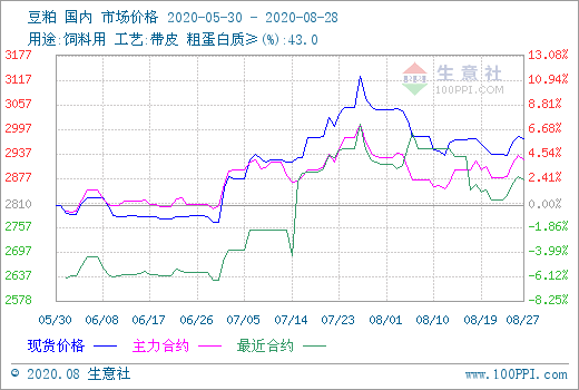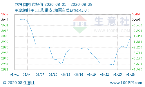 热点栏目据生意社数据监测:进入三季度,豆粕开始扭转乾坤,价格触底回升,7月豆粕振荡上涨为主,涨幅接近7%。8月开始,豆粕延续7月末弱势下跌行情,价格高台跳水,持续下跌,跌幅超过3%。月中尝试上涨并未成功,临近月末价格重回涨势,整个8月依旧下行为主,月初豆粕市场均价3045元/吨,月末豆粕市场均价3002元/吨,价格下跌1.4%。