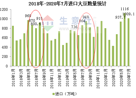 根据2018-2020年7月进口大豆统计图可以看出,历年来7-9月均是大豆进口量高峰期,尤其是2020年。今年4月我国进口大豆671万吨,5月高达937.7万吨,接近2018年和2019年最高数量。6月进口大豆数量更是高达1116万吨,7月我国大豆进口量也处于1000多万吨高位,为1009.1万吨,2020年,1-7月,我国进口大豆5513万吨,同比分别增长17.7%。