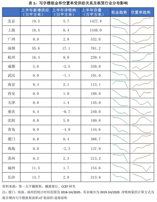 疫情冲击加剧一二线城市商务写字楼空置率上升和租金下行压力