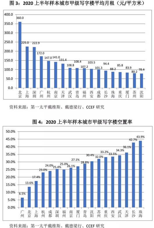 从楼盘地段和租金角度看,长期以来,一线城市核心商圈的顶级写字楼供不应求,外围区域供过于求,两者租金价差也因此不断走阔。2020年上半年,京沪深三地中央核心商务区空置率均略有上升,而次级商务区空置率下降,租赁市场有逐渐去中心化的趋势。因此下半年一线城市顶级楼盘的降租空间较大;二线城市楼盘仍处于“以价换量”的阶段,降租空间较一线城市更窄,预计未来业主将进一步承压。