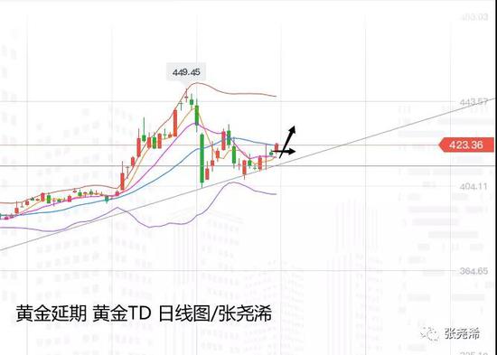 黄金TD:昨日晚间开于419.80元/克后,在下幅走低触及均线支撑附近418.58元,至此走势开始跟随国际黄金反弹而走高,今日周一又在延续晚盘的收盘价420.84元/克而再度走高,早盘一度触及布林带中轨附近及423元/克上方,并通知多单先行获利出场。