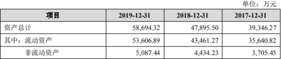 2016年至2019年,振邦智能资产总计分别为4.04亿元、3.93亿元、4.79亿元、5.87亿元;其中,流动资产分别为3.75亿元、3.56亿元、4.35亿元、5.36亿元;非流动资产分别为2901.71万元、3705.45万元、4434.23万元、5087.44万元。