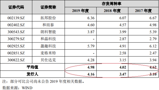 2016年至2019年,振邦智能存货周转率分别为3.08次、3.10次、3.47次、4.16次;行业均值分别为5.00次、4.62次、4.02次、4.98次。