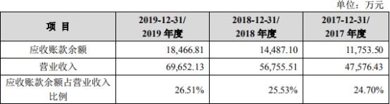 2016年至2019年,振邦智能应收账款余额分别为8704.08万元、1.18亿元、1.44亿元、1.85亿元;占营业收入比例分别为24.77%、24.70%、25.53%、26.51%。