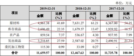 2016年至2019年,振邦智能存货中,原材料分别为2940.69万元、6367.00万元、7631.27万元、4861.38万元;库存商品分别为1363.85万元、1939.92万元、1679.57万元、2606.49万元;发出商品分别为4049.89万元、2490.91万元、2587.02万元、3216.85万元。