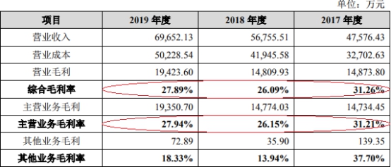 2016年至2019年,振邦智能综合毛利率分别为37.70%、31.26%、26.09%、27.89%;其中,主营业务毛利率分别为37.75%、31.21%、26.15%、27.94%。