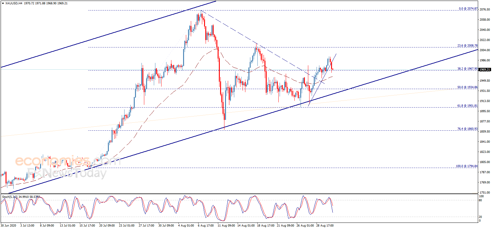 Economies.com在文章中写道,金价周二在一度接近2000.00美元/盎司关口后回落,并测试关键支撑1967.90美元/盎司。