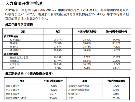 以近期颇有热搜体制的中行为例,其是四大行中人员最为稳定的银行。这是中行2019年年报中公布的数据: