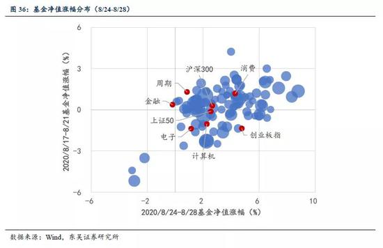 本图表以沪深300、创业板指、上证50、3个中信风格指数和2个申万指数(电子,计算机)为参考,选取规模前100偏股混合型和普通股票型基金;气泡大小代表规模。