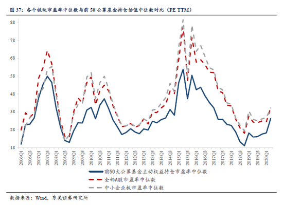 -目前基金持仓估值中位数相比过往牛市仍有距离:在剔除了PE 300以上以及-300以下的极值持仓之外,目前2020Q2的前50大基金主动权益持仓估值中位数为34.31,相比过往2007Q3的57.9、2010Q4的45.3和2015Q2的61.8相比仍然具有一定的空间,我们认为这不乏有金融地产估值持续走低的拖累