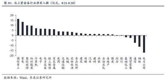 最近一周北上资金净买入额前三行业:国防军工、电力设备、机械;卖出前三行业:公用事业、钢铁和通信。