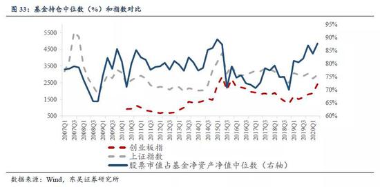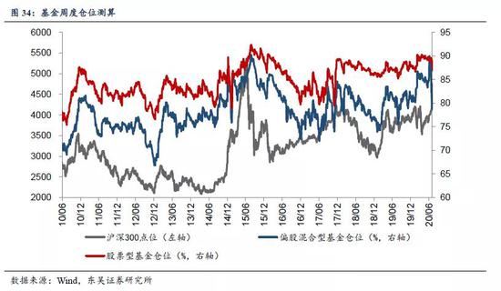 股票持仓占比处于历史高位。基金市场的主动权益基金(普通股票型基金、偏股混合型基金和灵活配置型基金)中股票投资占比的中位数由2019Q2的81%增至目前2020Q2的88%,对权益资产的偏好有大幅提升。而目前88%的股票仓位中位数也处在历史高位,高于2007Q4的79%、2010Q4的85%和2015Q2的87%,仅次于2015Q1的89%。