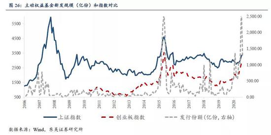 月度新发基金规模已显著下滑:目前2020年8月基金发行份额达到1265亿份,8月基金发行的热度较7月的2820亿份已经出现显著的下滑。而回顾过去每轮行情的上扬都伴随着公募新基金的巨额发行,2007年8月主动权益基金发行规模达到415.96亿份之后,9月发行规模萎靡至50亿份,随后行情于10月见顶;2011年中小板牛市,2011年10月主动权益类基金发行规模达到107亿份后,11月发行规模仅49亿份,11月中小板行情见顶;2015年5月主动权益类基金发行规模达到2600亿份,6月发行规模降至1780亿份,仅为之前一个月的68%,行情于6月见顶。