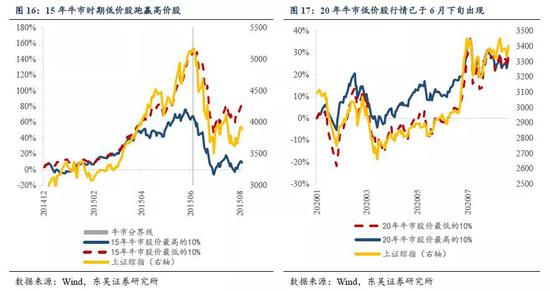 -过往牛市期间尾部股票有跑赢头部股票的现象,然而本轮牛市之中尾部股票的行情还未大范围出现:从绝对股价高低的角度来看,前三轮牛市普遍是牛市后期低价股胜出,此轮牛市目前低价股累计涨幅于6月中下旬起迅速爬升,目前已和高价股持平。从市盈率的角度来看,2007年牛市时期市盈率最低的股票跑赢了市盈率最高的股票。从净利润同比增速的角度来看,2015年牛市末期之际业绩最低的公司跑赢了业绩最高的公司。然而本轮牛市从市盈率和净利润的角度来看都没有出现尾部股票跑赢头部股票的现象。