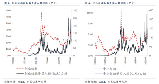 目前融资买入额在持续下降的通道之中:本轮行情中融资买入额周度顶点出现在7月10日这一周,上证、创业板和中小板的融资买入额分别达到875.85、244.31和412.98亿元(周度),在8月7日这一周融资买入额有所反弹,但仍不及7月10日高点时期的位置。目前最新一周融资买入额(周度)仅有384.02、164.51和151.62亿元,虽然创业板和中小板融资买入额略有回升,但仍与最高点相差甚远。