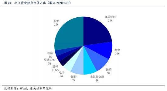 截止2020/8/28目前北上资金持仓市值前三大行业:食品饮料、家电、医药;后三行业:综合金融、综合、纺织服装。